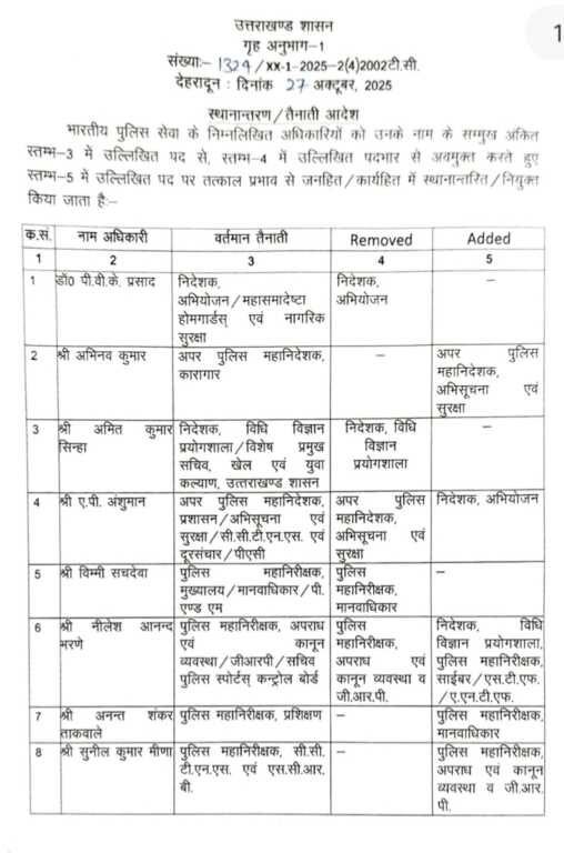 दीपावली के बाद शासन ने कई आईपीएस और पीपीएस अधिकारियों के तबादले किए, देखिए किसे कहाँ मिली नई जिम्मेदारी