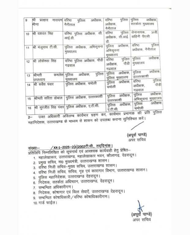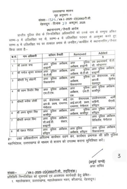 उत्तराखंड शासन ने दीपावली के बाद बड़ा पुलिस फेरबदल किया है। यह उत्तराखंड 2025 का अब तक का सबसे बड़ा तबादला है जिसमें नैनीताल, उत्तरकाशी, चमोली और पौड़ी के एसएसपी–एसपी बदले गए हैं। तबादले की पूरी जानकारी नीचे लिस्ट में दी गई है जानिए किसे कहाँ मिली नई जिम्मेदारी।